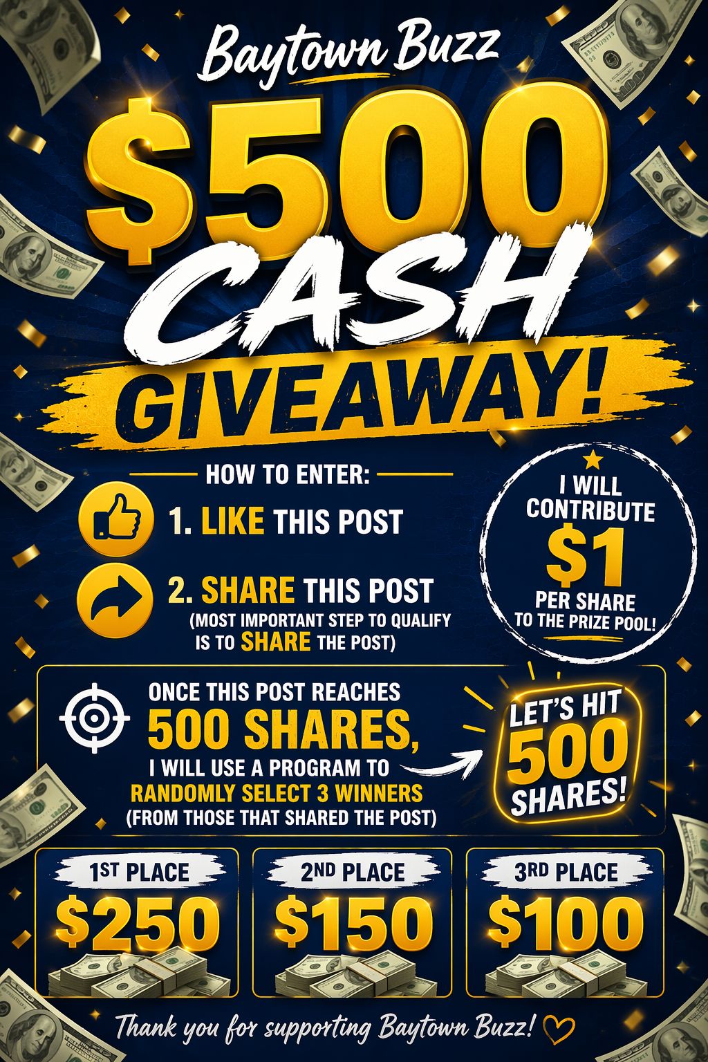 Note: Winners will be randomly selected using a drawing program once we hit that 500-share milestone. Let’s make it happen, Baytown!
