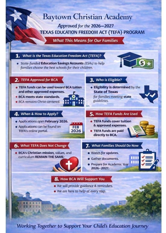 Baytown Christian Academy is celebrating exciting news after being officially approved for the 2026–2027 Texas Education Freedom Act (TEFA) Program, which means eligible families may be able to use state-funded Education Savings Accounts (ESAs) toward BCA tuition and approved education expenses — all while the school’s Christ-centered mission, values, and curriculum remain unchanged. With applications expected to open in February 2026, this could open new doors for families exploring faith-based education in our community, and BCA encourages parents who are curious about enrollment, eligibility, or how the program works to reach out directly to the school for more information. More info: https://www.facebook.com/gobca.org